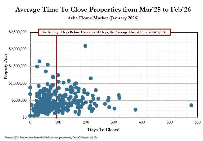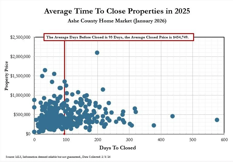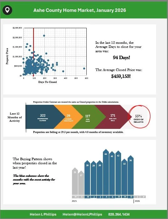 The Ashe County home market in January 2026 shows signs of cooling. Whereas Days on the Market and the list to sell ratio are down, they are only slightly down. The number on the market is down, from 158 to 117 in January. Odds of Selling remain at 55%, at least in part due to less homes on the market for a seller to compete with.