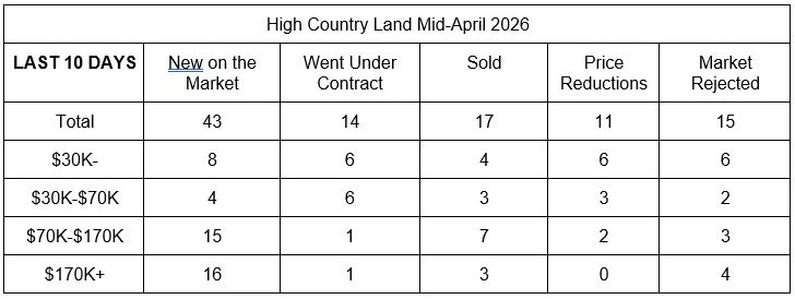 With High Country land, the number on the market is slightly higher than at the beginning of April. While some new listings have come on the market, it’s a much slower increase. 2% of land tracts on the market sold in the past 10 days. 4% of land tracts left the market in the past 10 days [under contract, sold, or market rejected]. Price reductions remain much lower than in the homes market, at 1% of the land tracts on the market.