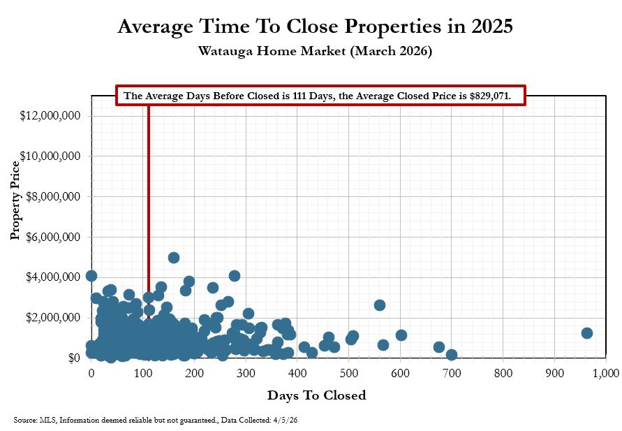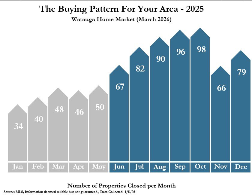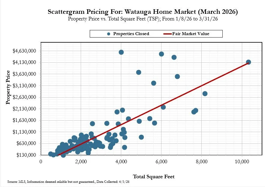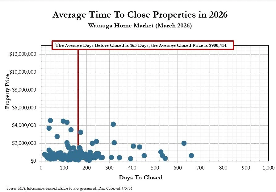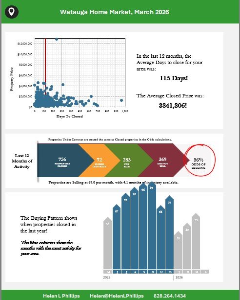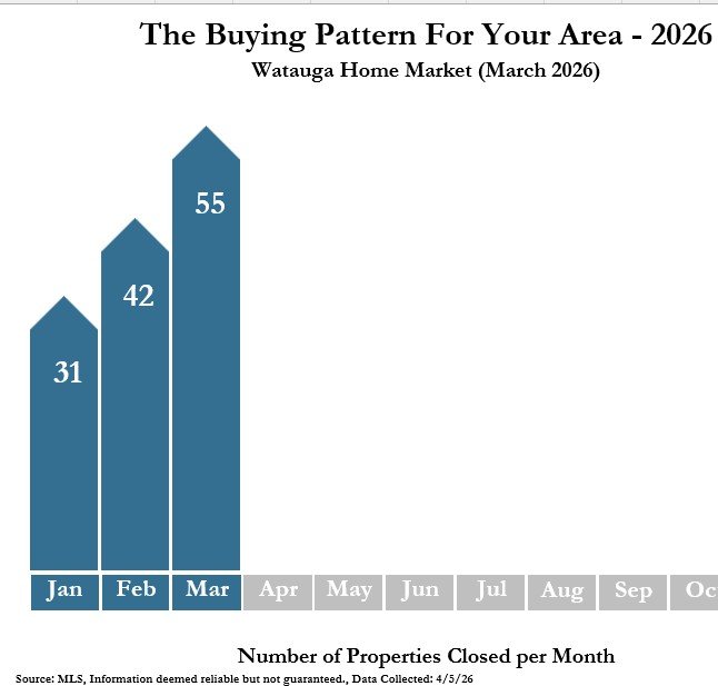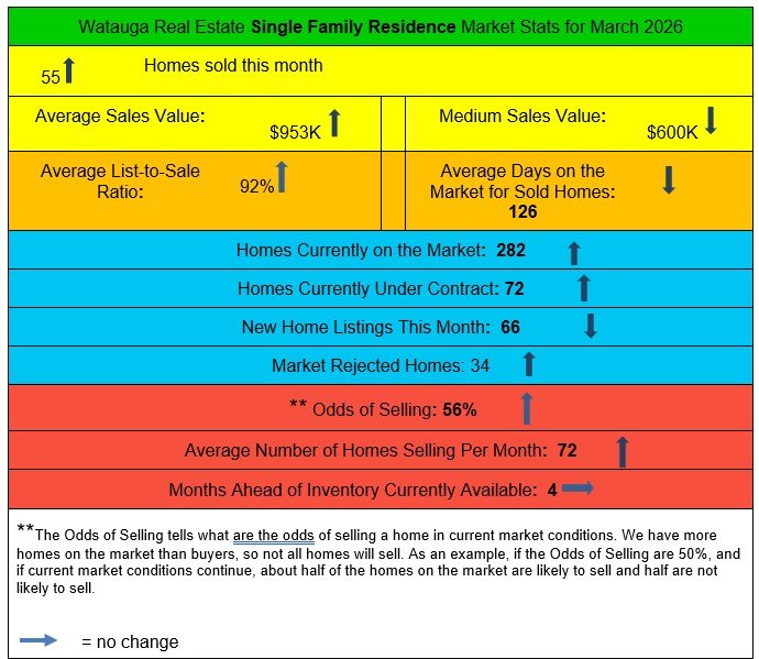 In the Watauga home market, the number sold is up a bit from the very low level of sales in January and February. The average sales value increased quite a bit, which includes a number of sales well over $1 mil. Sales are happening a tad faster, with a slightly higher list-to-sale ratio. The Odds of Selling have picked up - good news for sellers!
