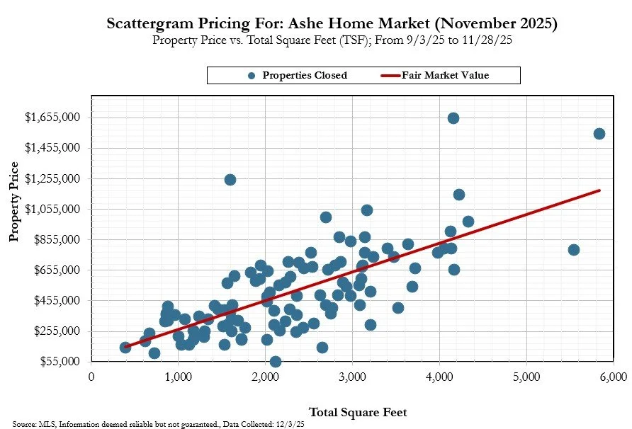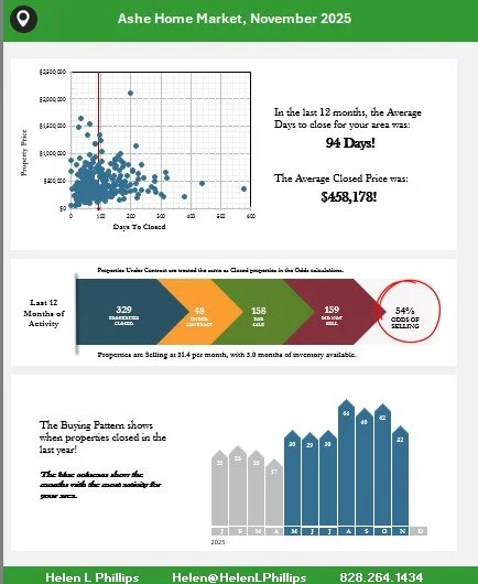 Within that overall picture, less homes are on the market and less sold in Ashe during November. Holding steady for Ashe are: the Odds of Selling a home, the number selling per month [the past 12 months’ average is 31 per month], the number under contract, and the number that are market rejected [leave the market unsold].